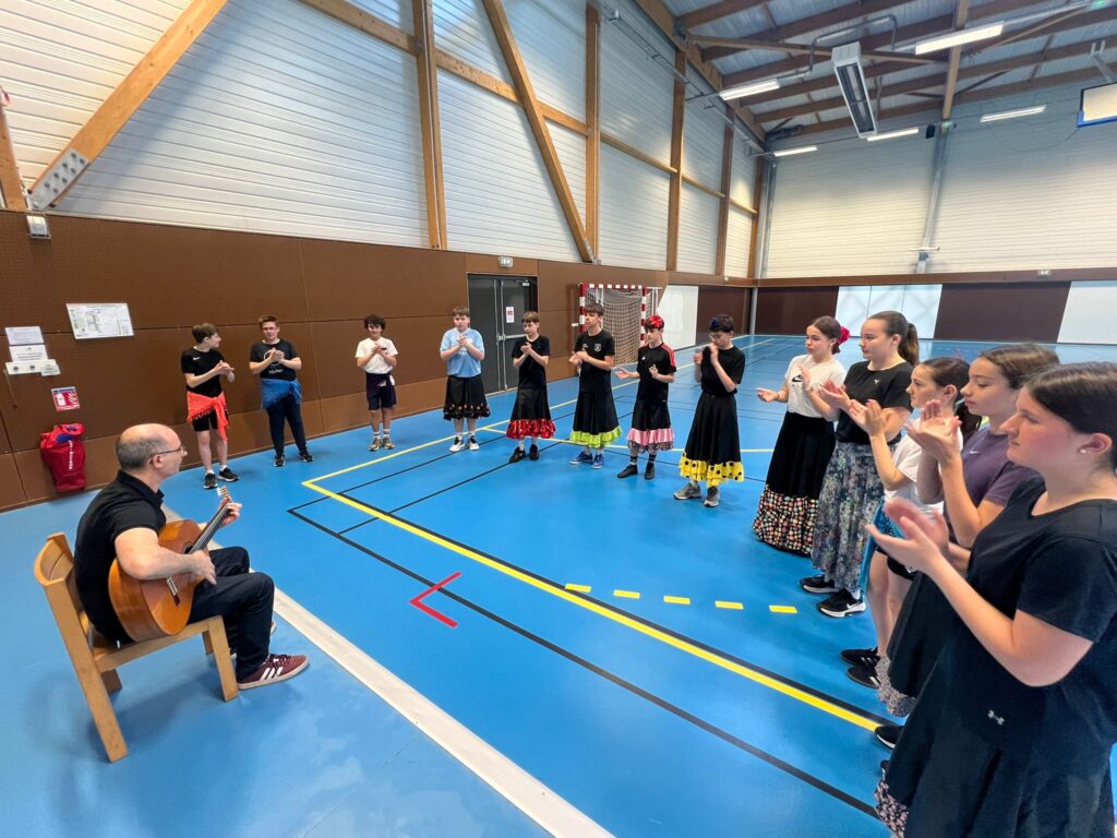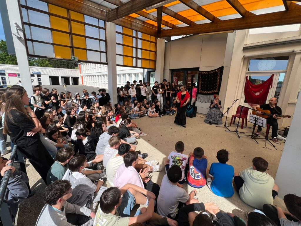 Pour prolonger ce moment de partage, les intervenants ont également offert à l’ensemble du collège un temps fort sur la pause méridienne. Dans la cour, élèves et personnels ont pu assister à un spectacle de flamenco, découvrant ainsi toute la richesse et l’intensité de cet art. Ce moment convivial a permis de valoriser le travail réalisé le matin tout en ouvrant cette expérience culturelle à tous.