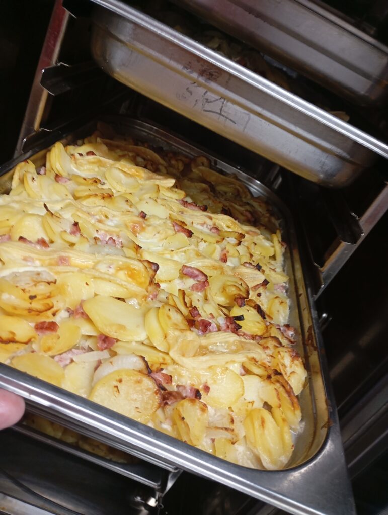 À 7h00 la prise des températures des armoires froides est réalisée puis débute la fabrication. L’offre alimentaire est composée de 3 variétés d’entrées dont au moins une crudité tous les jours, de 2 plats chauds protidiques avec proposition d’un plat végétarien une fois par semaine, de 2 garnitures (1 légume, 1 féculent), de 3 produits laitiers (fromage à la coupe, portions et yaourts), de 4 desserts au choix avec des fruits de saison tous les jours.